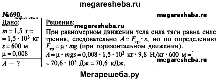 690. Какая работа совершается двигателем при равномерном перемещении по рельсам вагонетки массой 1,5 т на расстояние 600 м, если коэффициент трения равен 0,008?