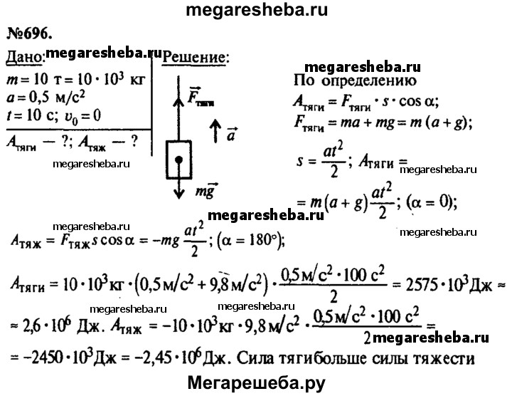 696. Груженая шахтная клеть массой 10 т поднимается с ускорением 0,5 м/с2. Определите работу по подъему клети за первые 10 с движения и работу силы тяжести. Объясните разницу значений работ.