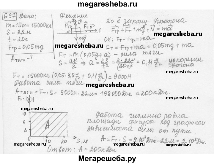 697. Чему равна работа силы тяги, действующей на вагон, если, начав двигаться равноускоренно, вагон массой 15 т прошел путь 22 м за 20 с и сила трения составляла 5% от веса вагона? Решите задачу аналитически и графически.