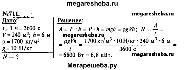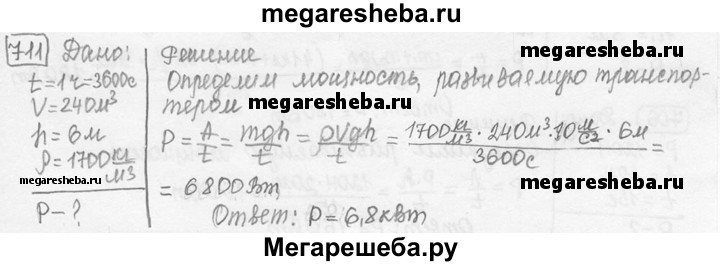 711. Транспортер поднимает за 1 ч гравий объемом 240 м3 на высоту 6 м. Определите мощность его двигателя. (Плотность гравия 1700 кг/м3.)