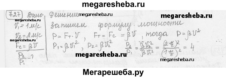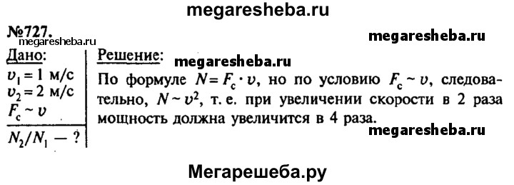 727. Во сколько раз надо увеличить полезную мощность, затрачиваемую на движение лодки, чтобы увеличить ее скорость от 1 до 2 м/с, если сопротивление воды пропорционально скорости?