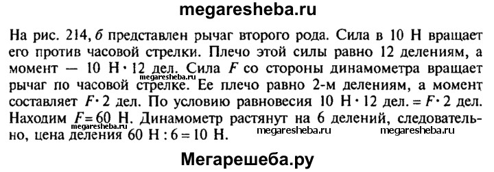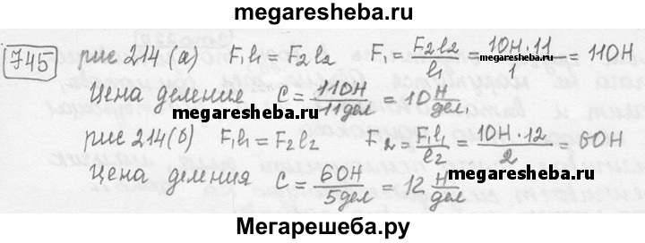 745. Определите цену деления динамометров (рис. 214, а, б), если рычаги с подвешенными к их концам грузами по 10 Н каждый находятся в равновесии. (Весом рычагов пренебречь.)