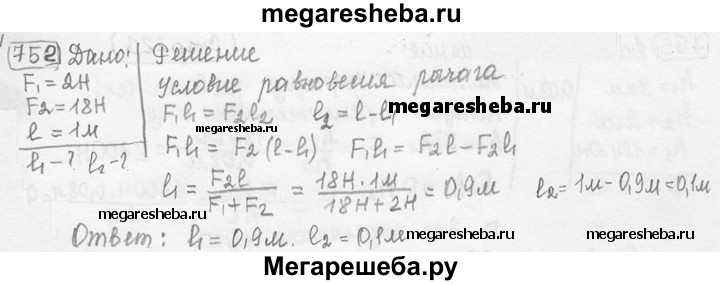 752. На концах рычага действуют силы 2 и 18 Н. Длина рычага равна 1 м. Где находится точка опоры, если рычаг в равновесии? (Весом рычага пренебречь.)