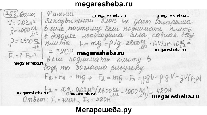 769. При помощи неподвижного блока поднимают из воды гранитную плиту объемом 0,03 м3. Какую силу прилагают рабочие, когда плита находится в воде; над поверхностью воды? (Трение не учитывать.)