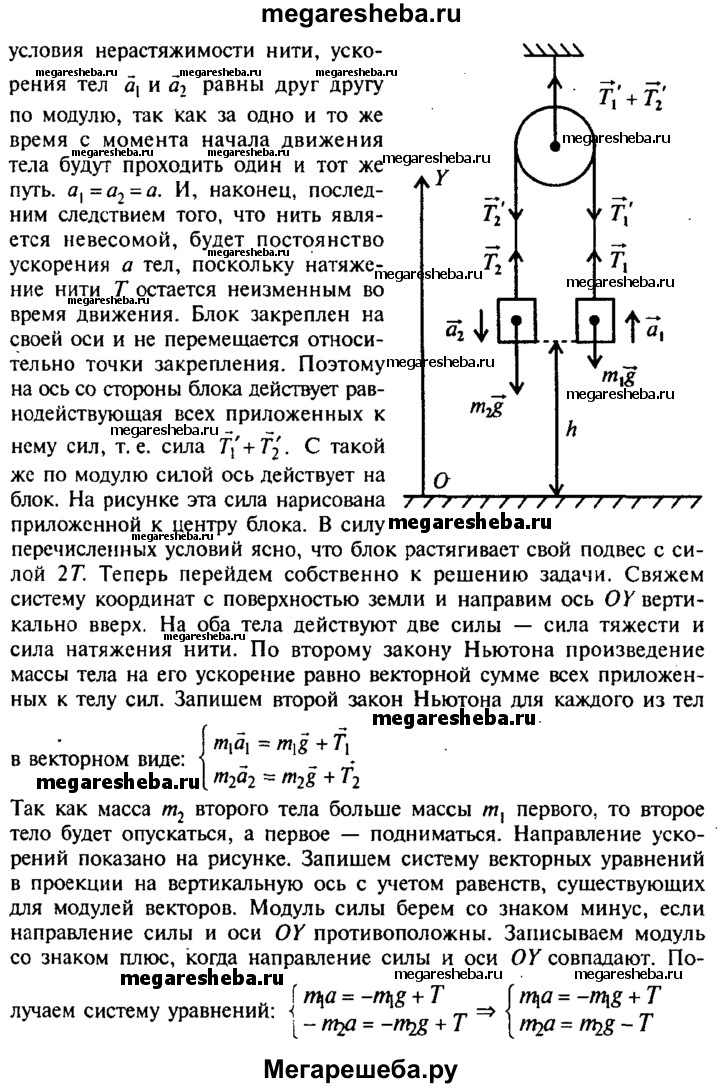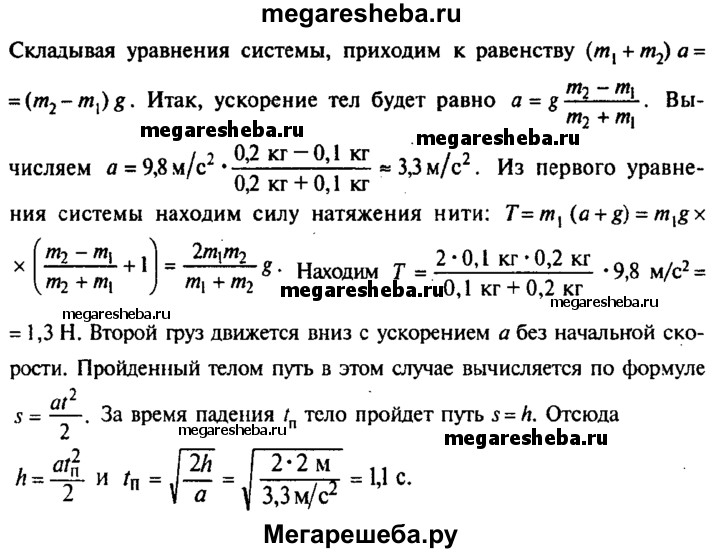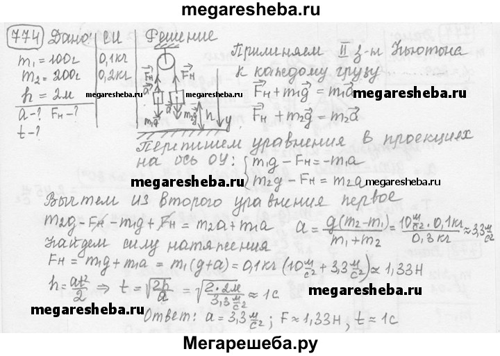 774. На концах невесомой нерастяжимой нити, перекинутой через легкий неподвижный блок, подвешены два груза, массы которых равны 100 и 200 г. В начальный момент времени грузы покоятся на высоте 2 м от пола. Пренебрегая трением, определите ускорение грузов, натяжение нити при движении грузов и время, за которое груз массой 200 г достигнет пола.