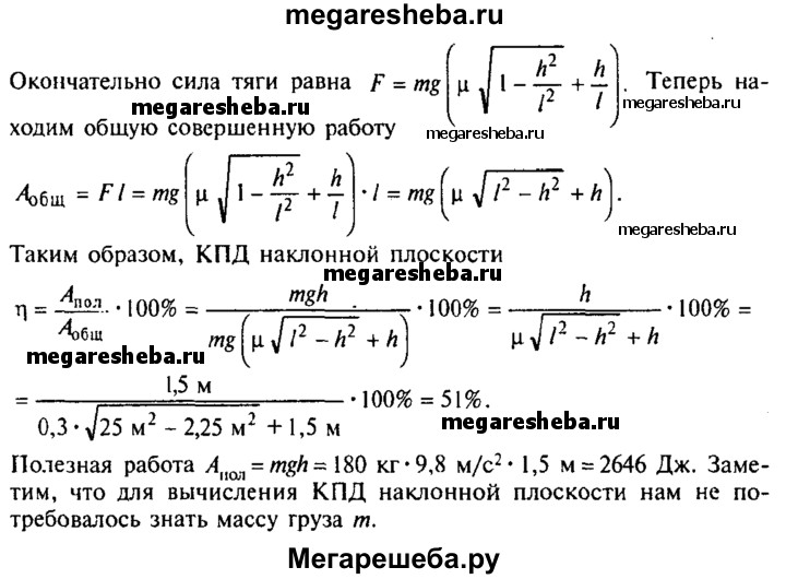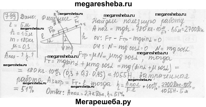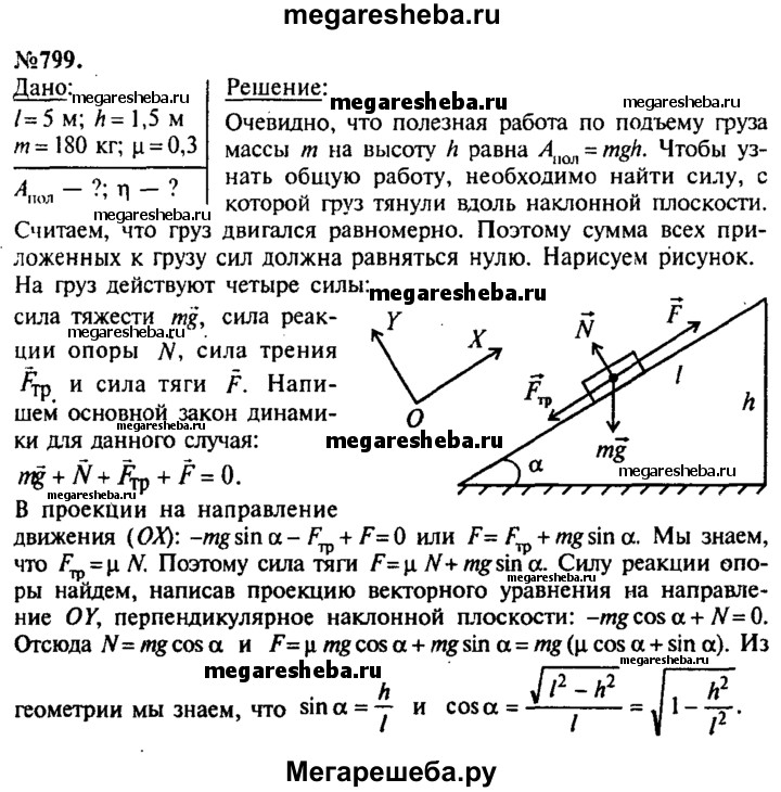 799. По наклонной плоскости длиной 5 м и высотой 1,5 м поднимается груз массой 180 кг. Чему равны полезная работа и КПД, если коэффициент трений равен 0,3?