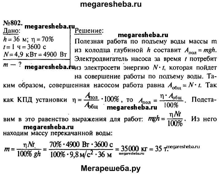 802. Сколько воды можно поднять из колодца глубиной 36 м в течение 1 ч, если мощность электродвигателя насоса равна 4,9 кВт, а КПД установки равен 70%?