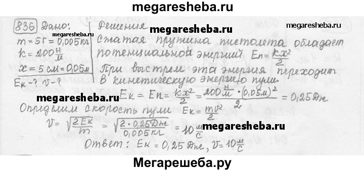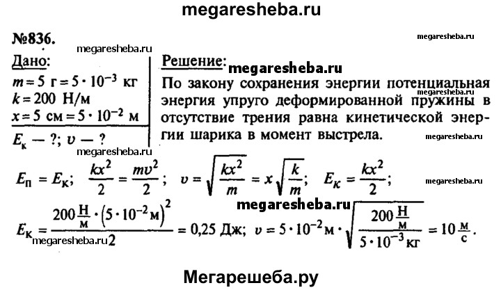 836. Определите кинетическую энергию и скорость шарика массой 5 г в момент вылета из ствола пружинного игрушечного пистолета, если жесткость пружины равна 200 Н/м, а до выстрела она была сжата на 5 см. (Трением можно пренебречь.)