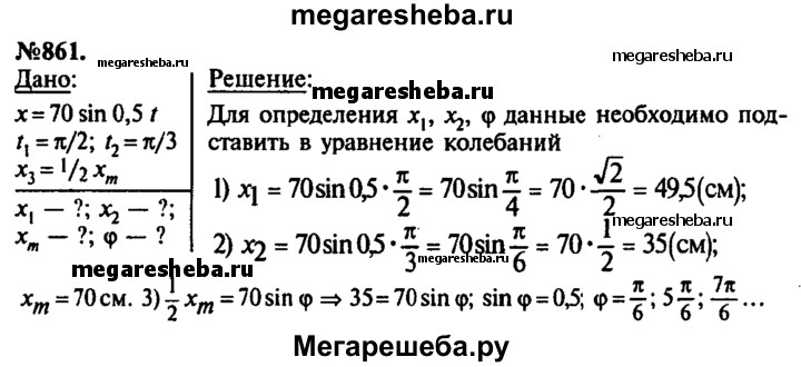 861. Колебания материальной точки описываются следующим уравнением: х = = 70 sin 0,51. Определите амплитуду колебаний и смещение точки от положения равновесия в следующие моменты времени: ?х = л/2 и t2 = я/3. При каких фазах смещение по модулю равно половине амплитуды?
