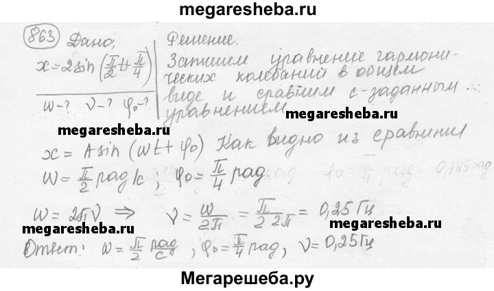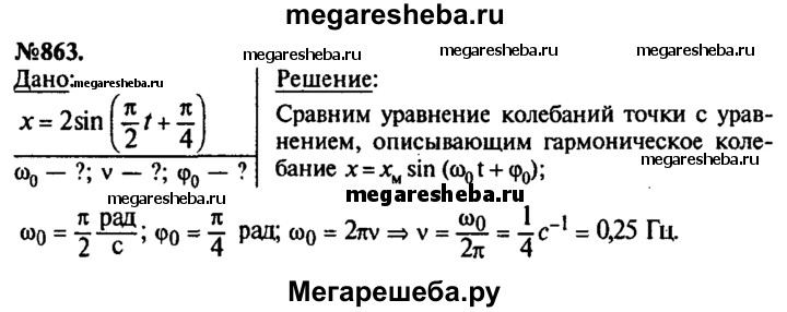 863. Гармоническое колебание описывается уравнением х = 2 sin ( — t + — J. Чему равны циклическая частота колебаний, линейная частота колебаний, начальная фаза колебаний?
