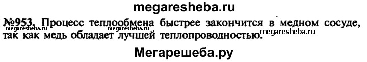 953. Медный и стеклянный сосуды одинаковой массы и вместимости одновременно заполнили горячей водой. В каком сосуде быстрее закончится процесс теплообмена?