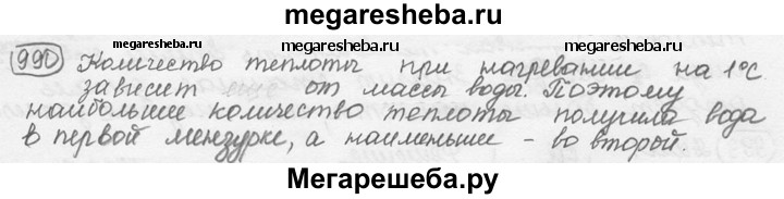 990. Пусть в трех мензурках температура воды повысилась на один градус (см. рис. 9). Одинаковое ли количество теплоты получила вода в мензурках? В какой — наибольшее; в какой — наименьшее? Объясните почему.