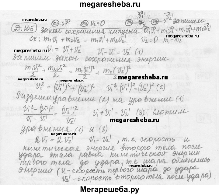 Д. 105. На основании законов сохранения докажите, что при центральном упругом ударе двух тел одинаковой массы, первое из которых движется, а второе покоится, произойдет остановка первого тела. При этом второе тело приобретет такую же кинетическую энергию, какой обладало первое тело до удара.