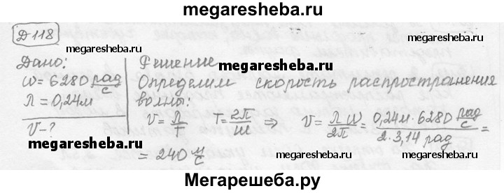 Д. 118. Используя соотношение, приведенное в условии предыдущей задачи, по рисунку 251 определите скорость распространения волны, если циклическая частота колебаний частиц упругой среды равна 6280 рад/с.