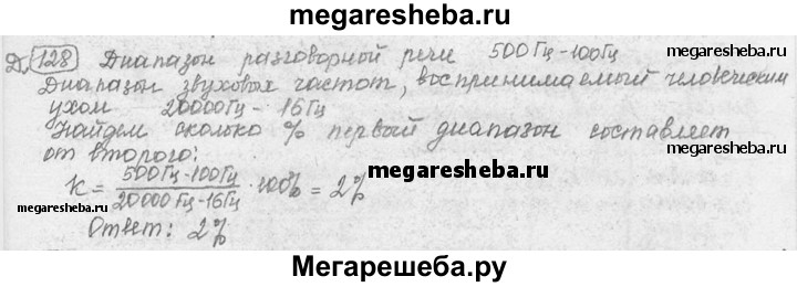 Д. 128. Частоты звуков разговорной речи человека лежат в пределах 100—500 Гц. Какую долю, выраженную в процентах, составляет диапазон частот разговорной речи от диапазона частот звуков, слышимых человеком?