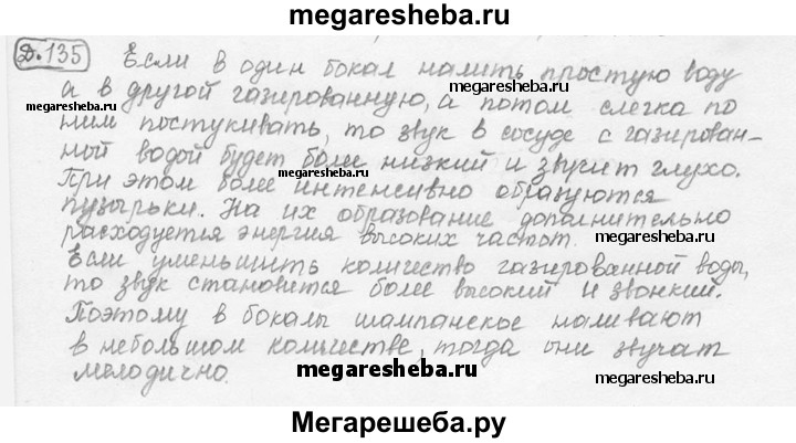 Д. 135. Проведите эксперимент: наполните на 3/4 объема один из двух хрустальных одинаковых бокалов (или стаканов из тонкого стекла) простой водой, а другой — таким же количеством газированной воды. Проанализируйте звучание сосудов и состояние жидкостей при возбуждении в них колебаний. Попытайтесь объяснить, почему в высокие хрустальные бокалы принято наливать небольшое количество шампанского.