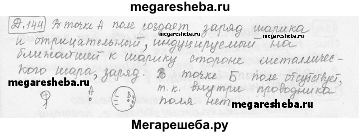 Д. 144. Небольшой заряженный шарик 1 (рис. 18д) поместили вблизи большого металлического незаряженного шара 2. Существует ли и какими зарядами порождено электрическое поле в точках А и Б?