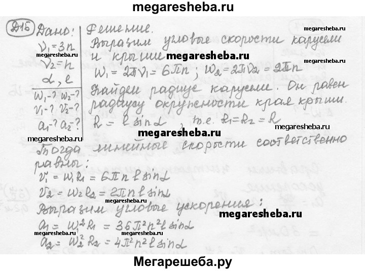 Д. 15. Карусель и крыша над каруселью одинакового диаметра вращаются вокруг вертикальной оси О в одном направлении с частотами Зn и n соответственно (рис. 4д). Скат крыши длиной l образует с осью вращения угол а. Определите: 1) угловые скорости карусели и крыши над ней, 2) линейные скорости крайних точек карусели и крыши, 3) центростремительное ускорение этих точек.