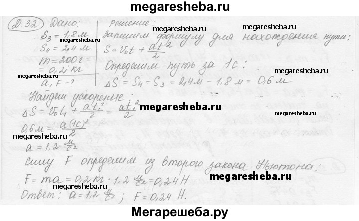 Д. 32. Под действием постоянной силы за третью секунду движения тело массой 200 г прошло путь, равный 1,8 м, а за четвертую секунду — путь, равный 2,4 м. Определите ускорение и силу, сообщающую телу ускорение.