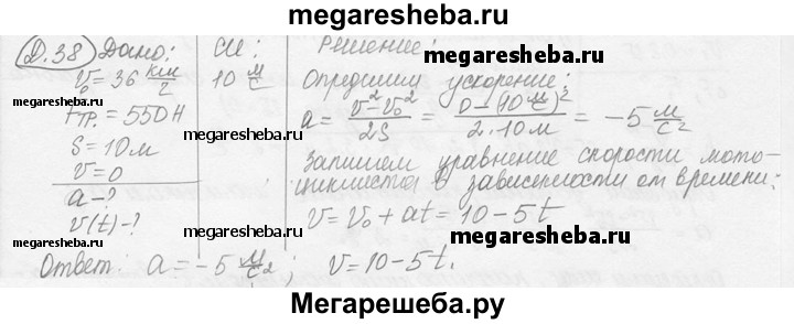 Д. 38. Мотоциклист, ехавший со скоростью 36 км/ч, резко затормозил. Сила трения составила 550 Н на тормозном пути 10 м. Определите ускорение и напишите уравнение скорости мотоциклиста в зависимости от времени.