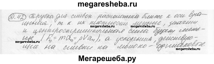 Д. 42. В молочном сепараторе цельное молоко поступает по вертикальному каналу в центр вращающегося сосуда. Какая из отводных трубок сепаратора расположена ближе к оси вращения — для снятого молока или для сливок?