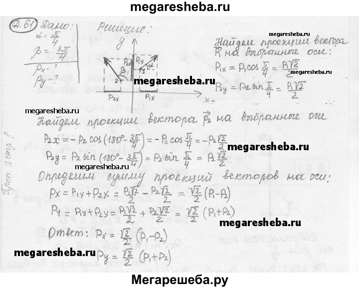 Д. 61. Импульсы двух Рис 12д тел представлены на рисунке 12д с помощью векторов. Вектор импульса pi образует с положительным направлением оси X угол к/4, а вектор импульса р угол Зл/4. Определите сумму проекций векторов на каждую из осей координат и ее знак.