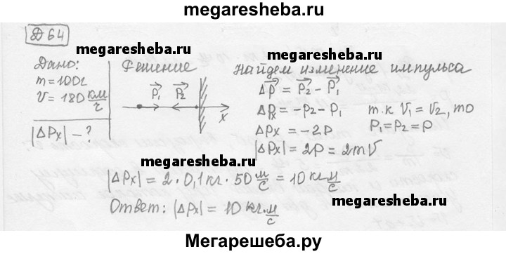 Д. 64. Теннисный мяч массой 100 г, летящий со скоростью 180 км/ч перпендикулярно вертикальной стене, отскакивает от нее без заметной потери скорости в противоположном направлении. Определите модуль изменения проекции импульса |Арх| на ось, совпадающую с направлением движения мяча до удара.