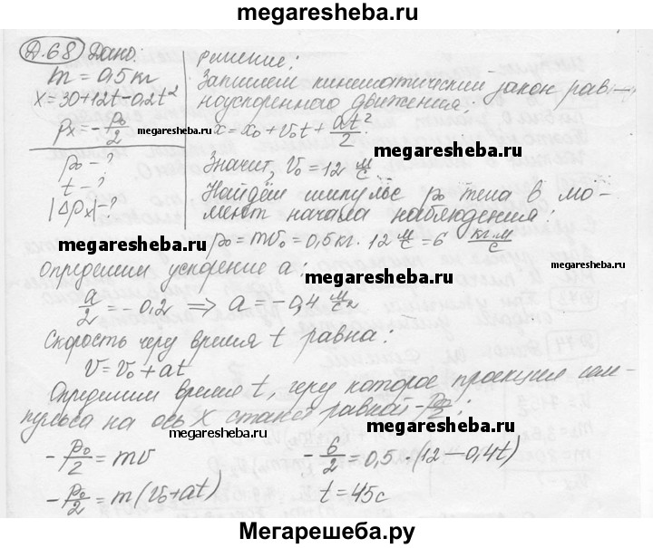 Д. 68. Движение тела массой 0,5 кг описывается уравнением х = 30+ 12t-0,2t2. Определите импульс р0 тела в момент начала наблюдения. Сколько времени пройдет до того момента, как проекция импульса на ось X станет равной -р0/21 Определите модуль изменения проекции импульса.