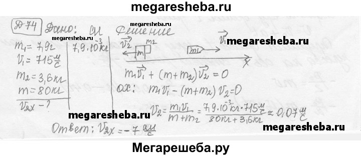 Д. 74. Скорость пули массой 7,9 г при вылете из ствола автомата Калашникова равна 715 м/с. Определите проекцию вектора скорости, сообщаемой автоматчику массой 80 кг, на направление движения пули, если масса автомата равна 3,6 кг.