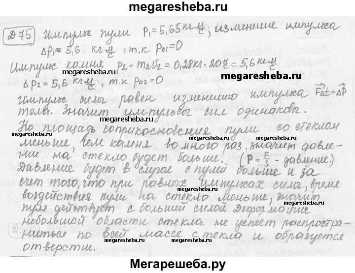 Д. 75. Почему пуля, о которой идет речь в предыдущей задаче, пробивает в стекле небольшое отверстие, а камень массой 280 г, летящий со скоростью 20 м/с, разбивает стекло?