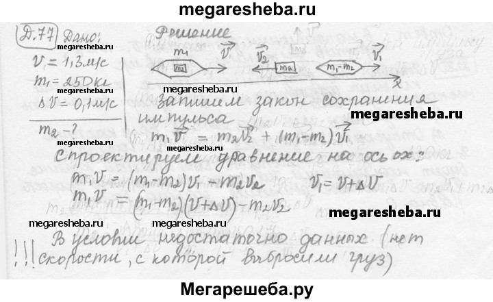 Д. 77. С отплывающей от берега со скоростью 1,3 м/с лодки, масса которой вместе с человеком равна 250 кг, в горизонтальном направлении сбросили на берег груз. Чему равна масса груза, если скорость лодки увеличилась на 0,1 м/с?