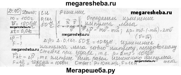 Д. 90. По данным условия задачи Д. 64 определите: какой импульс сообщает мяч вертикальной стенке при абсолютно упругом ударе; среднюю силу, с которой стена действует на мяч, если тела находились в контакте в течение 0,01 с.