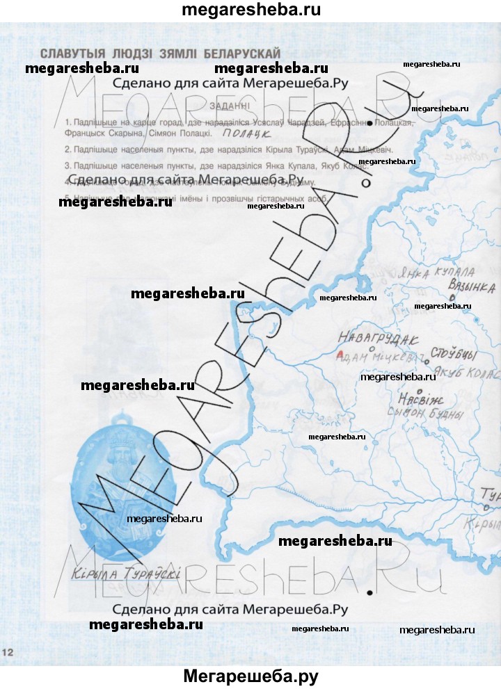 Подробный решебник (ГДЗ) по Человеку и миру за 4 (четвертый) класс контурные карты - готовый ответ страница номер - Страница 12 - СЛАВУТЫЯ ЛЮДЗІ ЗЯМЛІ БЕЛАРУСКАЙ . Авторы учебника: . Издательство: Белкартография 2015.