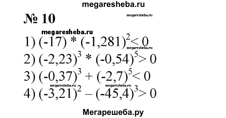 10. Не вычисляя, выяснить, положительно или отрицательно значение выражения: 1) (-17)-(-1,281)^2; 2) (-2,23)^3*(-0,54)^5; 3) (-0,37)^3 + (-2,7)^5; 4) (-3,21)^2-(-45,4)^3.