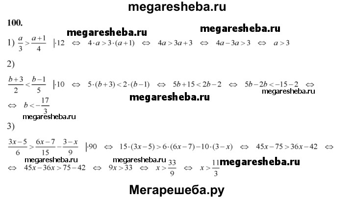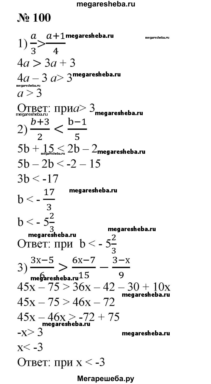100. 1) При каких а значение дроби a/3 больше значения дроби a +1/4? 2) При каких b значение дроби b +3 / 2 меньше значения дробиb – 1/ 5? 3) При каких х значение дроби 3x – 5 /6 больше значения разности дробей 6x -7 / 15 и 3 – x / 9? 4) При каких х значение суммы дробей 2 – 5x / 4 и 7x – 3 / 6 меньше значения дроби 2x + 5/18?