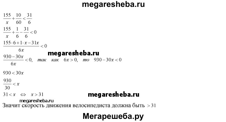 114. На соревнованиях велосипедисты должны проехать 155 км. Велосипедисты стартуют поочередно с интервалом 5 мин, и каждый из них едет с постоянной скоростью. Скорость первого велосипедиста равна 30 км/ч. С какой скоростью должен двигаться третий велосипедист, чтобы прибыть к финишу раньше первого?