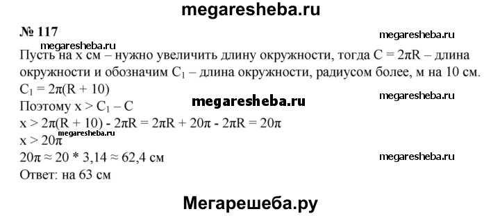 117. На какое наименьшее целое число сантиметров нужно увеличить длину окружности, чтобы ее радиус увеличился более чем на 10 см? (Длина с окружности радиуса R равна: c = 2πR, где π = 3,14... .)