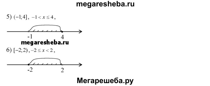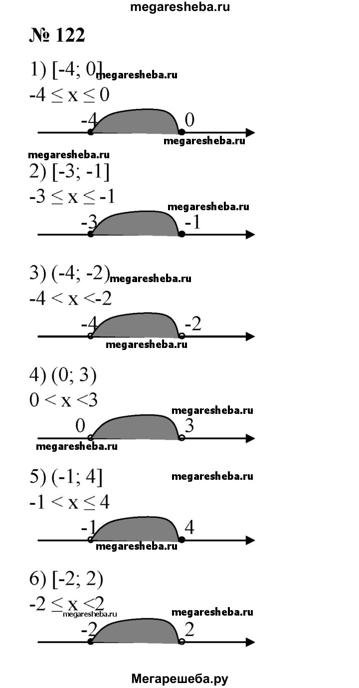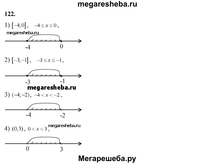 122. Множество чисел х, принадлежащих данному числовому промежутку, записать в виде двойного неравенства и изобразить его на числовой оси: 1) [-4; 0]; 2) [-3; -1]; 3) (-4; -2); 4) (0; 3); 5) (-1; 4]; 6) [-2; 2).