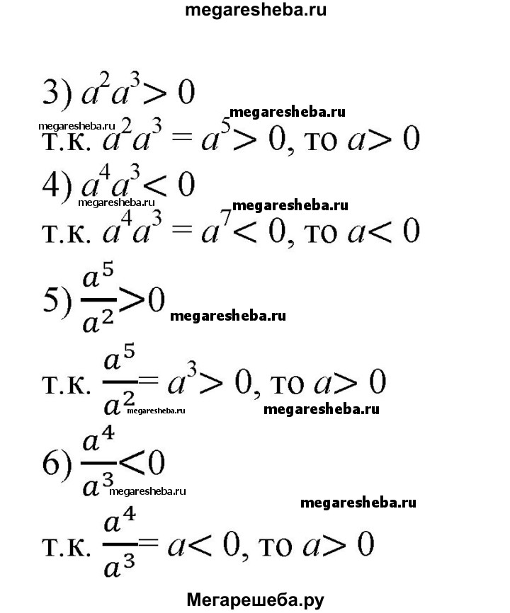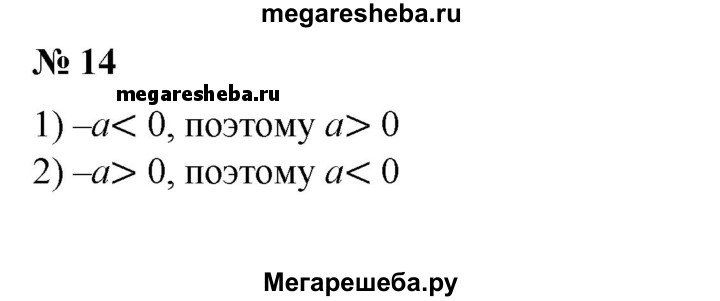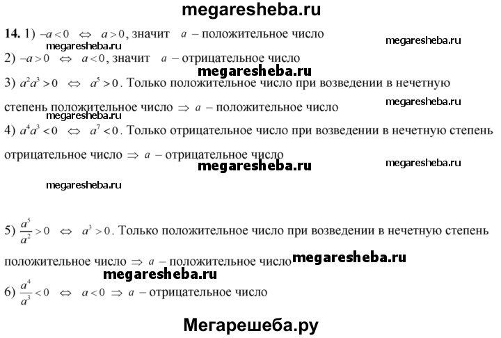 14. Выяснить, положительно или отрицательно число а, если: 1) -а < 0; 2) -а > 0; 3) а^2а^3>0; 4) а^4а^3< 0; 5)a^5/a^2 > 0; 6) a^4/a^3 < 0.