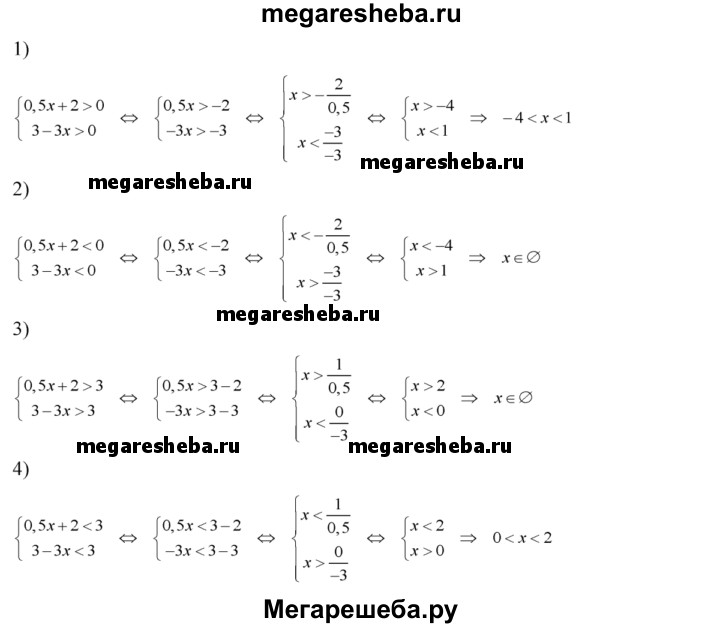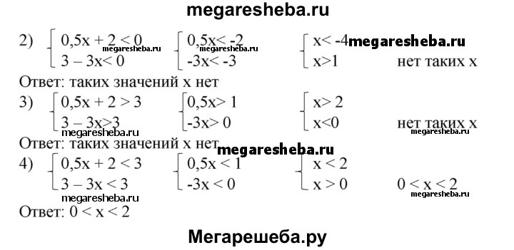 142. Указать значения х (если они существуют), при которых значения функций у = 0,5x + 2 и у = 3 - Зх одновременно: 1) положительны; 2) отрицательны; 3) больше 3; 4) меньше 3. Ответ проиллюстрировать с помощью графиков данных функций, построенных на одной координатной плоскости.