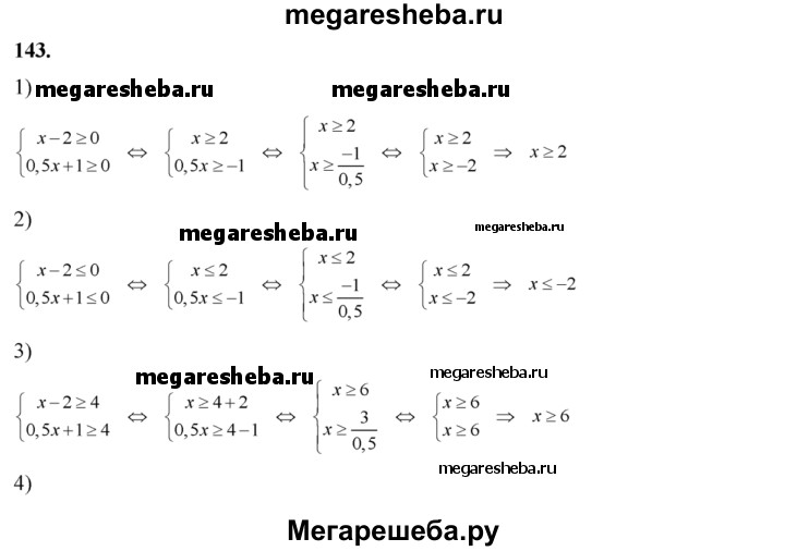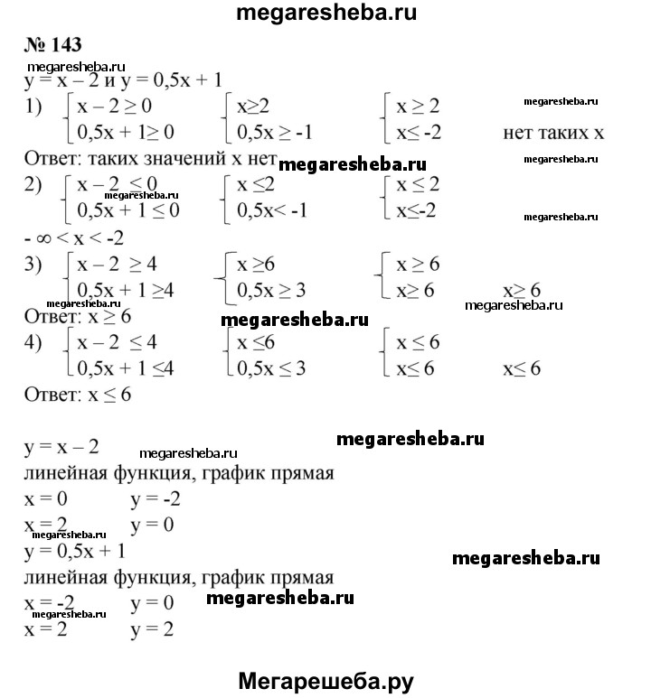 143. При каких х значения функций у=х-2 и у = 0,5х+1 одновременно: 1) неотрицательны; 2) неположительны; 3) не меньше 4; 4) не больше 4? Ответ проиллюстрировать с помощью графиков данных функций, построенных на одной координатной плоскости.