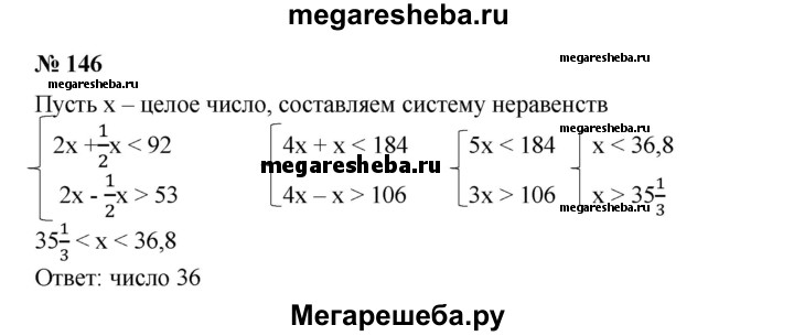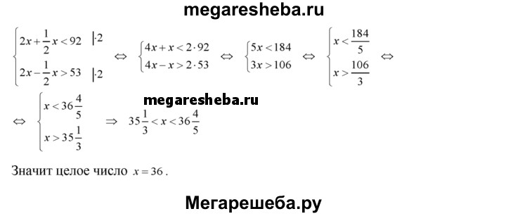 146. Если к удвоенному целому числу прибавить его половину, то получится число, меньшее 92, а если из удвоенного этого же целого числа вычесть его половину, то получится число, большее 53. Найти это целое число.