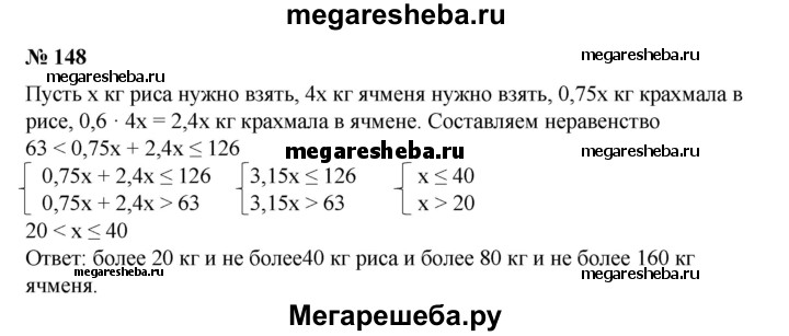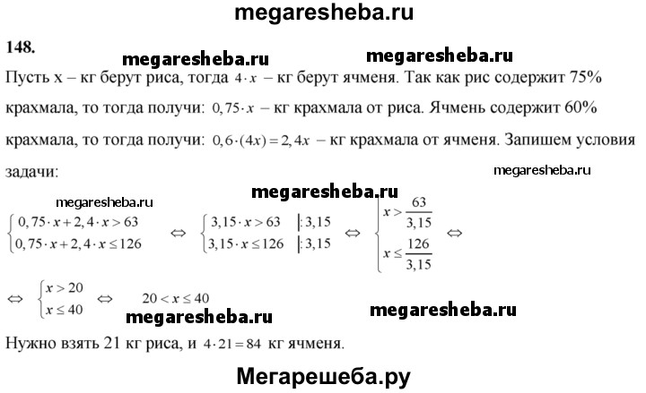 148. Для получения крахмала берут рис и ячмень, причем ячменя берут в 4 раза больше, чем риса. Сколько килограммов риса и ячменя нужно взять, чтобы получить больше 63 кг, но не больше 126 кг крахмала, если рис содержит 75% крахмала, а ячмень — 60%?