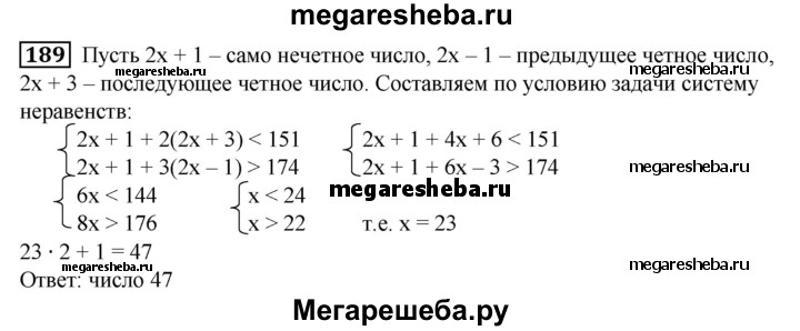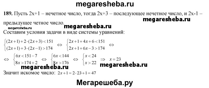 189. Сумма нечетного числа с удвоенным последующим нечетным числом меньше 151, а сумма этого же нечетного числа с утроенным предыдущим нечетным числом больше 174. Найти это число.