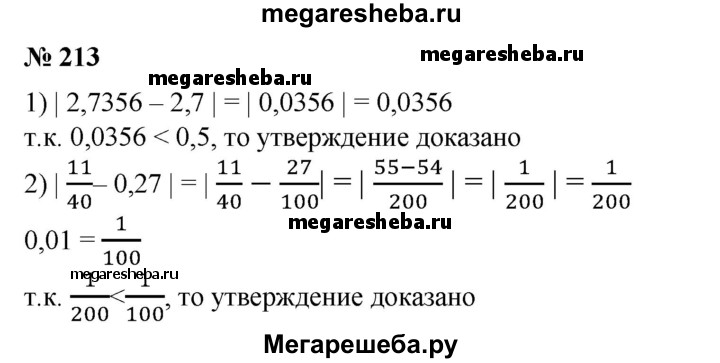 213. Доказать, что: 1) 2,7 есть приближенное значение числа 2,7356 с точностью до 0,5; 2) число 0,27 является приближенным значением дроби 11/40 с точностью до 0,01.?