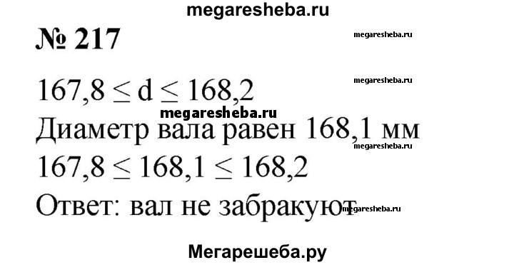 217. В отделе технического контроля (ОТК) завода измеряется диаметр вала с точностью до 0,1 мм. По таблице допусков диаметр d вала должен быть в промежутке 167,8 ≤ d ≤ 168,2. Забракует ли ОТК вал, если в результате измерения его диаметр равен 168,1 мм?