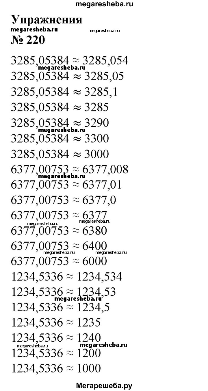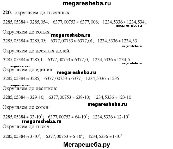220. Округлить числа последовательно до тысячных, сотых, десятых долей, единиц, десятков, сотен, тысяч: 3285,05384; 6377,00753; 1234,5336.