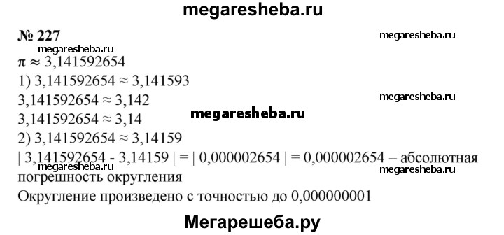 227. Число π ≈ 3,141592654 есть отношение длины окружности к ее диаметру. 1) Округлить это число до миллионных, тысячных, сотых. 2) С какой точностью проведено округление, если в записи оставлено 5 цифр после запятой?