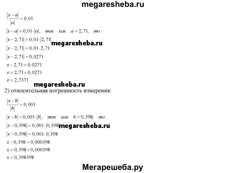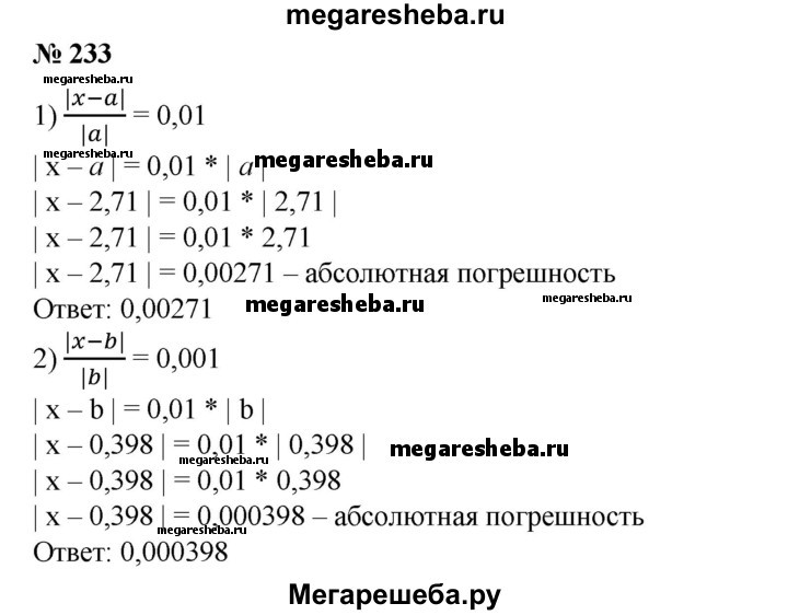 233. 1) Приближенное значение числа х равно а. Относительная погрешность этого приближения равна 0,01, т. е. 1%. Найти абсолютную погрешность, если а = 2,71. 2) Приближенное значение числа х равно Ь. Относительная погрешность этого приближения равна 0,001, т. е. 0,1%. Найти абсолютную погрешность, если 6 = 0,398.