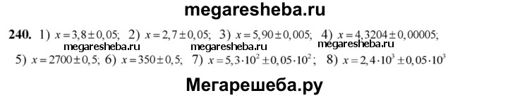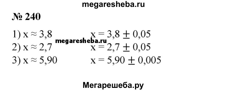 240. Условие вида x ≈ а (в записи а все цифры верные), записать в виде х = а ± h, если: 1) x ≈ 3,8; 2) х ≈ 2,7; 3) х ≈ 5,90; 4) х ≈ 4,3204; 5) х ≈ 2700; 6) х ≈ 350; 7) х ≈ 5,3 * 10^2; 8) x = 2,4 * 10^3.